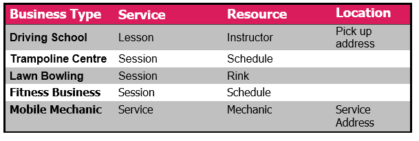 For example, if you run a tennis court business, you could change Resource to Court instead, and change Service to Session.